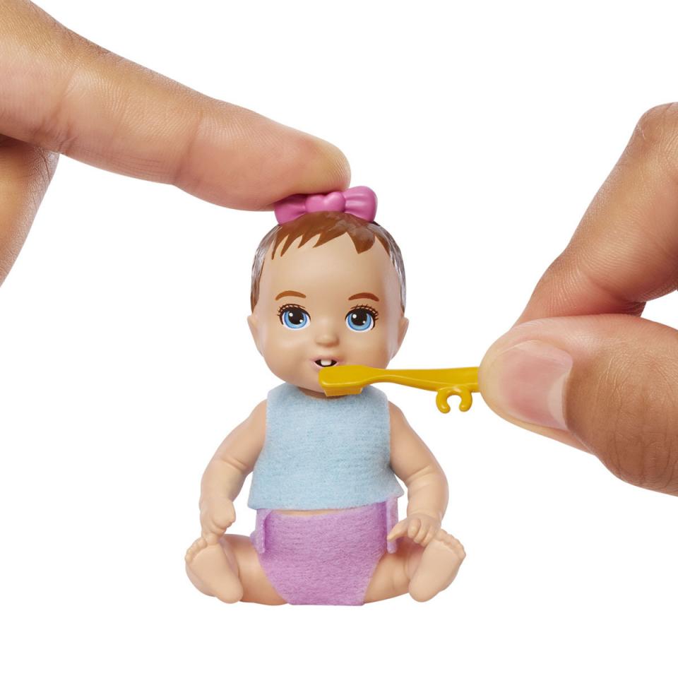 Splash splash! It’s time to play with the Barbie Skipper Babysitters Inc – High Chair Doll. Little ones will love getting their Skippers Babysitters doll ready to go out with this funBarbie Skipper Babysitters Inc. highchair and baby figure playset. It features everything you need for feeding time. The set includes a bottle, cup, highchair toys and toothpaste and toothbrush. Product features Play out classic babysitting moments with Barbie Skipper Babysitters Inc. playset that comes with a baby doll, themed accessories and a fun feature to immerse kids in role-play This set highlights feeding with a colour-change feature on the doll that kids can repeat over and over for wow moments and storytelling fun Keep baby happy in her chair with a snack or drink plus there are fun toys to play with When she’s finished, make sure you keep her teeth clearn with the toothpaste and toothbrush. For ages 3 and over.