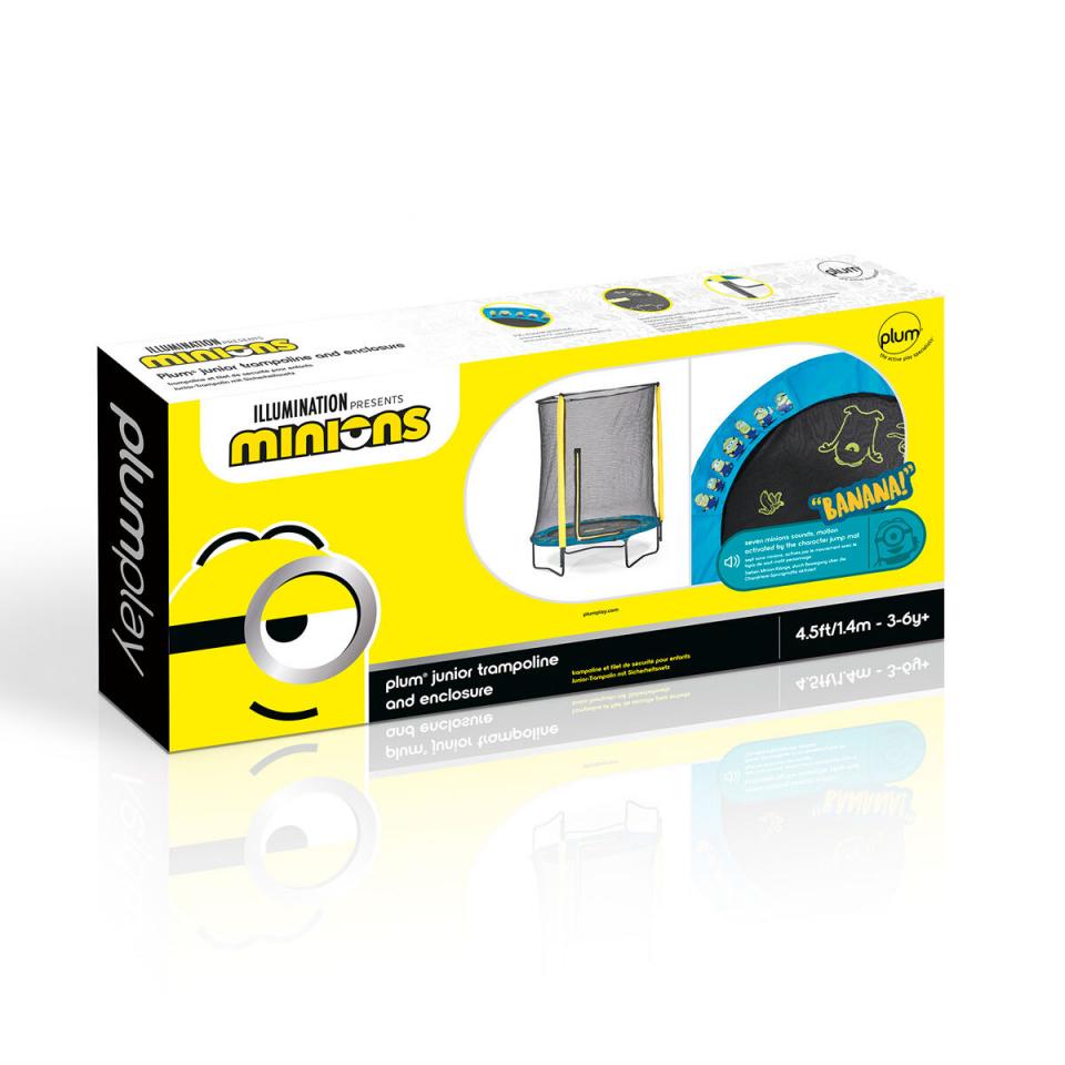 Get ready to go bananas with the Minions 4.5ft Trampoline and Enclosure from Plum, for even more fun this trampoline comes with sounds from the Minions! Specifically designed for young children, the 4.5ft Trampoline is a safe and secure way for children to start their jumping journey – alongside their favourite characters, bouncing on the Minions printed mat activates one of the eight sounds that little ones will recognise from their favourite movie. The battery powered sound box is simple to install and hidden away from jumpers. Product features This uniquely shaped enclosure poles and Minions print will add some fun to any backyard The lower height frame allows young explorers to bounce with confidence and easily climb up The PVC printed safety pad features favourite Minion characters and bouncing on the mat activiates sounds The trampoline frame is made from galvanised steel for rust protection Approximate dimensions: L140 x W140 x H180cm, please allow a 2m safety perimeter. Maximum user weight 40kg Suitable for ages 3 years + This item requires adult assembly, it will take 2 adults approximately 2 hours to build. This product is part of The Entertainer Online Only range.