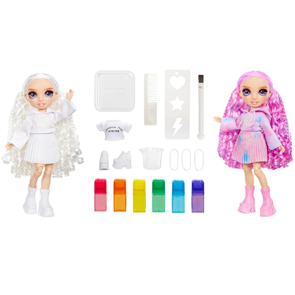 Rainbow High WaterColour & Create Purple Eyes Fashion Doll lets you custom your own Rainbow High doll in so many different ways, even with Tie-Dye. Just add water to the 6 rainbow-coloured powders to create watercolours, then dip her clothes and hair using the included dual end application sponge. You can even use the washable watercolours on your own hair. Repeat play, just wash in soap and water, let dry and start creating again! Product features: Rainbow High Watercolour & Create Fashion DIY Dolls inspire creativity. It’s so easy to design your own custom Rainbow High doll in so many different ways, even using Tie-Dye. Just add water to the 6 rainbow-coloured powders to create watercolours, then dip clothes and hair. Includes 6 colours (pink, orange, yellow, green, blue, and purple) to make so many colourful designs. For precision designs, dab the dual ended application sponge into the watercolours and then directly onto the clothes and hair. Includes rubber bands to create fun tie-dye designs- spirals, scrunch and so much more. The stencils make it easy to create fun shapes on the hair and fashions. In addition to the Doll dressed in an all-white outfit (sweater hoodie, pleated skirt, and white high-top sneakers), she comes with a bonus shirt and sneakers. Easy to do it over and over again. Just wash in soap and water, let dry and start creating again. Watercolours your hair too. Just dip or dab to add colour to your hair. Note: colour will be more vibrant on lighter hair. The Watercolor & Create Doll has beautiful long hair with curls and a small braid at the top, long eye lashes and purple glass eyes. Includes 1 fashion doll with complete all white doll outfit and doll shoes, bonus doll top, bonus doll sneakers, 6 rainbow washable watercolours, dual ended application sponge, rubber bands, stencil, measuring cup, disposable bowl, spoon and comb. Suitable for ages 4 years +