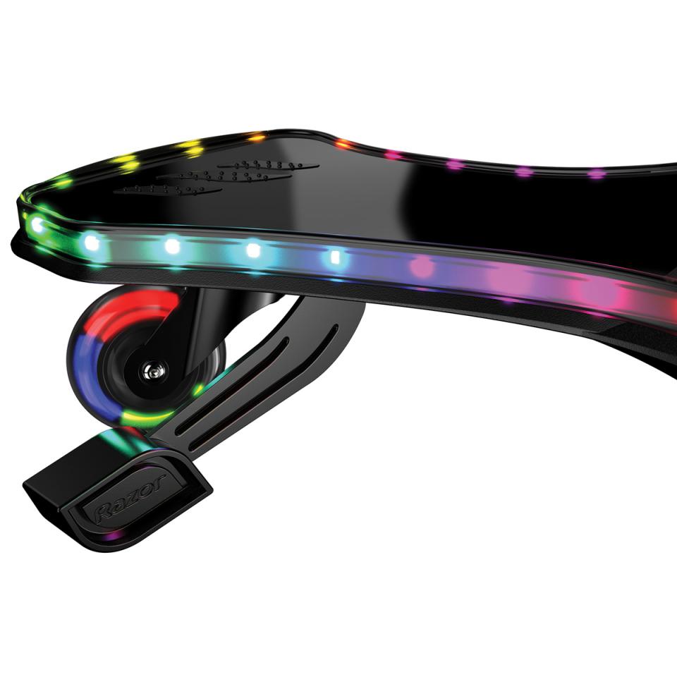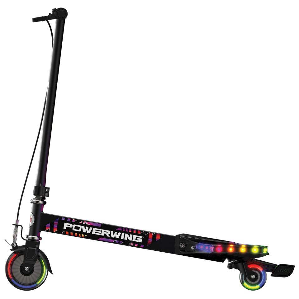 Quality meets timeless style with the Razor PowerWing Black Light Up 3 Wheeled Scooter. Get ready to spin and drift until the sun goes down with the unique three-wheeled Razor PowerWing Lightshow. Designed to make your kid’s childhood more memorable, this innovative caster scooter delivers unlimited side-to-side forward movement and features over 30 multi-coloured LED lights with five different light modes. The motion-activated light show shines through the translucent deck and urethane wheels to generate eye-popping colours. The hand- operated front fender brake and foam grips make stopping and control a breeze. Product features: Includes: 1x Ride On Trike Inclined rear caster wheels delivers radical drifting and spinning for non-stop fun Cool motion-activated LED lights automatically turn on and switch off after 20 seconds of inactivity to preserve battery life The hand-operated front fender brake and foam grips on the handlebars provide comfort and enhance control Built for long-lasting performance with a durable steel main beam frame with high-tech polymer wings Maximum rider weight 65kg Approximate Dimensions: 79.4 x 70.6 x 71.8 cm Battery requirements: 3 x AAA (included) Suitable for ages 6 years + This product is part of The Entertainer Online Only Range