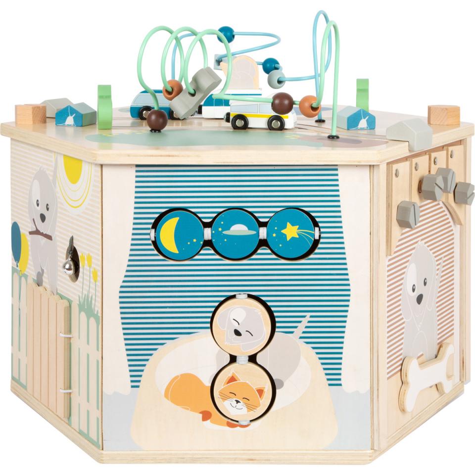 Develop little ones’ sense of responsibility and cognitive development with this Small Foot Wooden Pets Activity Cube. This sweet motor activity toy features 8 playable surfaces, including a sliding labyrinth, shape-fitting game, a spinning parts game, a threading/colours sorting game, and a construction game. Discover a removable, reversable lid with a chalkboard on one side, and even a bead maze and train tracks, including a three-passenger vehicle on one side. The reversible lid can also be used as a drawing table or play surface. Product Features: Includes: 1 x Small Foot Wooden Pets Activity Cube with 4 x toy cars, 8 x insertable elements, 2 x rails, 2 x houses, and 2 x trees Features a removable lid with a chalkboard that doubles as a drawing table The lovingly detailed illustrations depict animals everyday lives to little ones whilst they develop their cognitive development Approximate Dimensions: 43 x 50 x 57cm Suitable for ages 12 months + This product is part of The Entertainer Online Only range.