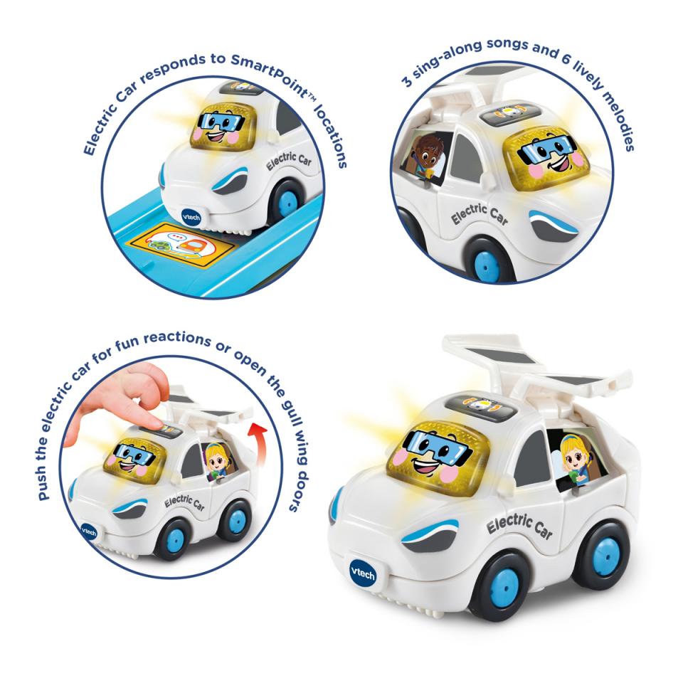 This VTech Toot-Toot Drivers electric car features lots of learning fun with different music, sounds and phrases. Drive into the learning zone with this cool streamlined car, perfectly sized for little hands This electric car is perfectly sized for little hands with a light up face button that triggers fun phrases, music, realistic sound effects and songs. Push the electric car along for more fun reactions or open the gull wing doors for manipulative play. Includes 3 sing-along songs and 6 lively melodies. Electric Car responds to SmartPoint locations with different phrases, sound effects and more on Toot-Toot Drivers play sets. Approximate Dimensions: 12 x 11 x 7 cm Batteries 2 x AAA (included) Suitable for age 1 year +
